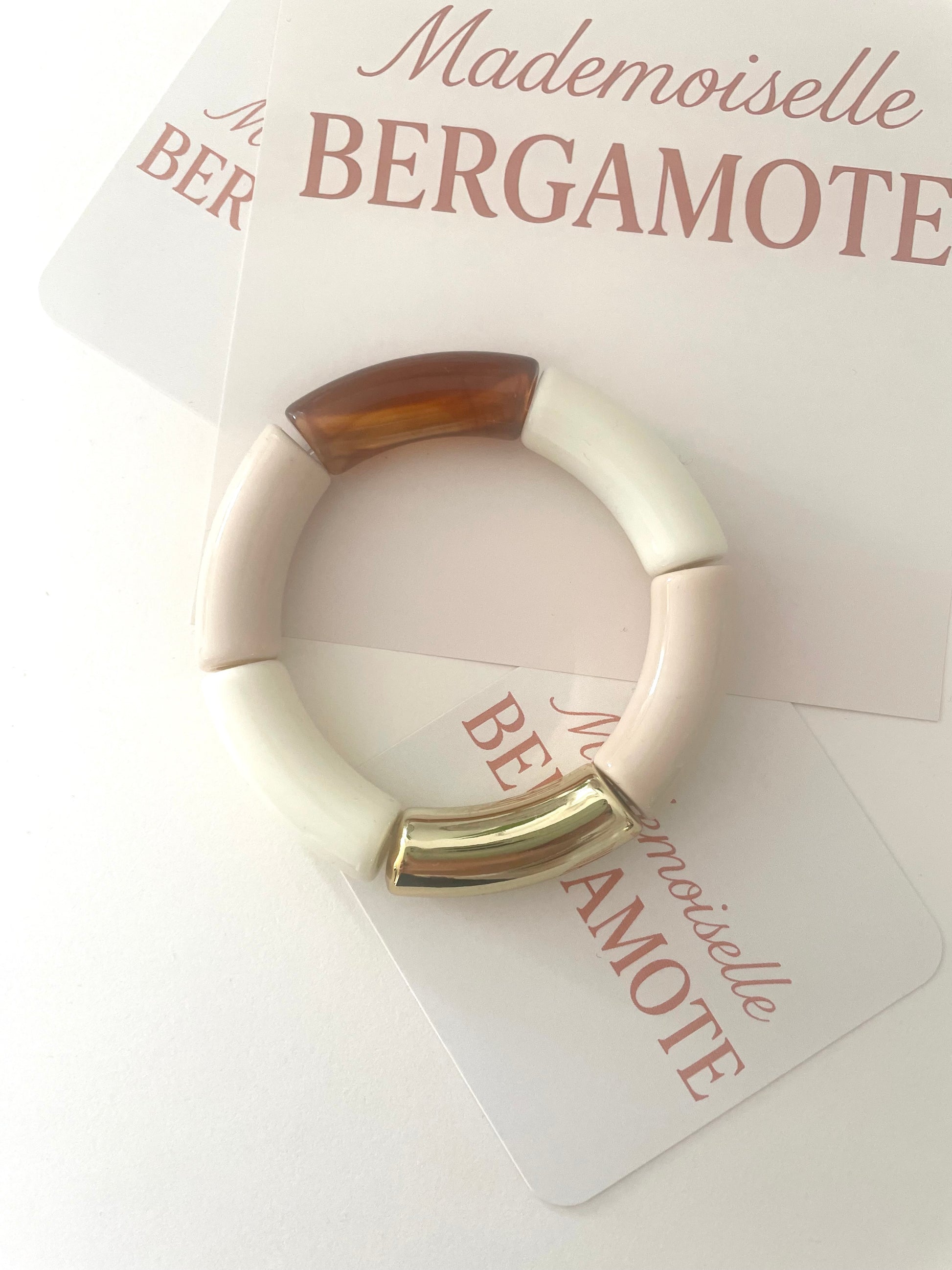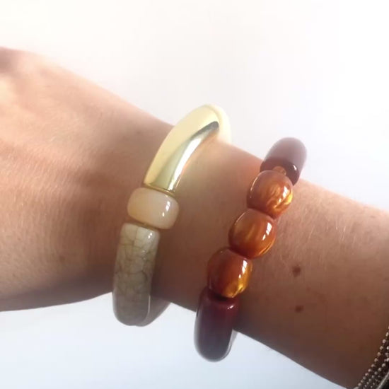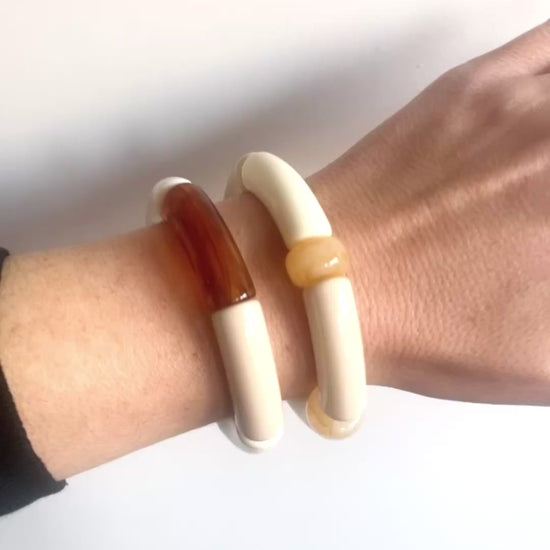 Des grosses perles tubes en résine, acrylique et bois, assemblées à la main. Le volume est là, la matière aussi — mais la palette neutre garde tout ça élégant. C'est le genre de pièce qui se remarque sans chercher à en faire trop.